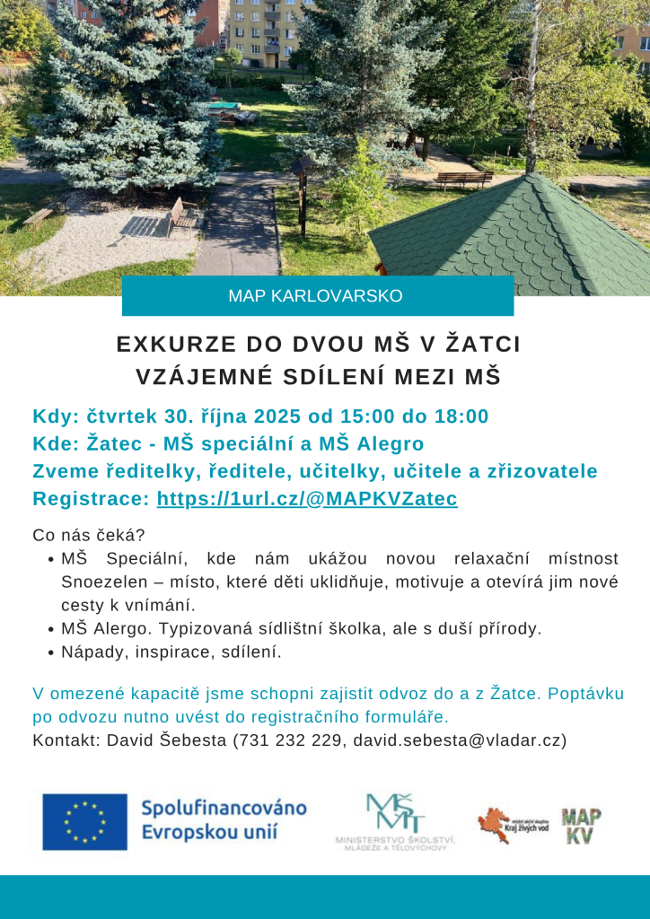 Exkurze do dvou mateřských škol v Žatci nabídne jedinečnou příležitost k vzájemnému sdílení. V MŠ Speciální vám představí relaxační místnost Snoezelen, která má pozitivní vliv na děti a jejich vnímání. Dále navštívíte MŠ Alergo, školku s přírodní atmosférou. Tato akce je určena pro všechny, kteří ma